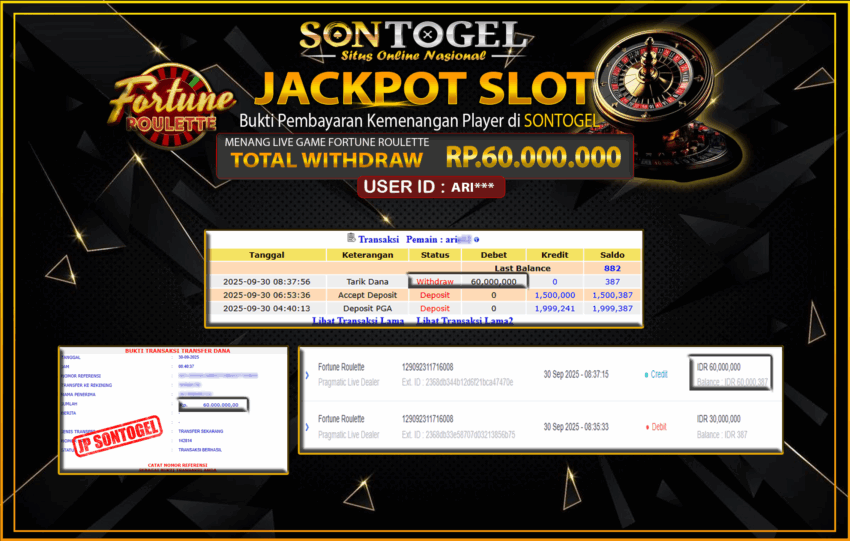 Selamat Kepada Member SONTOGEL dengan USER ID : ARI*** CASINO FORTUNE ROULETTE di provider LIVE GAME sebesar RP.60.000.000,- LUNAS langsung di  transfer ke rekening member tanpa kurang sepeserpun. Terimakasih telah mempercayakan SONTOGEL sebagai Situs Online Terpercaya dan Aman! Jangan tunggu tunggu lagi! langsung saja daftarkan akun bermain di SONTOGEL dan dapatkan bonus berlimpah setiap minggunya.