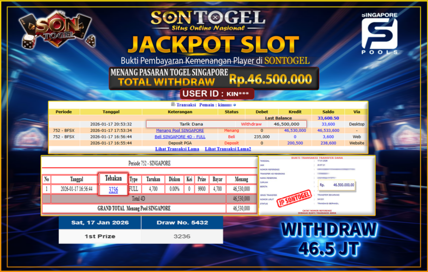Selamat Kepada Member SONTOGEL dengan USER ID : KIN*** JP SONTOGEL PASARAN SINGAPORE Rp.46.500.000,- LUNAS langsung di transfer ke rekening member tanpa kurang sepeserpun. Terimakasih telah mempercayakan SONTOGEL sebagai Situs Online Terpercaya dan Aman! Jangan tunggu tunggu lagi! langsung saja daftarkan akun bermain di SONTOGEL dan dapatkan bonus berlimpah setiap minggunya.