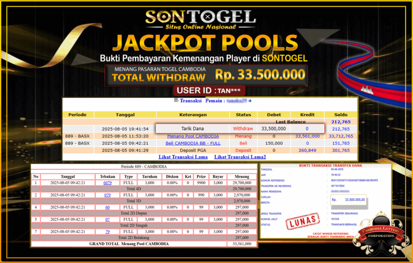 Selamat Kepada Member SONTOGEL dengan USER ID :TAN*** PASARAN TOGEL CAMBODIA sebesar RP.33.500.000,- LUNAS langsung di transfer ke rekening member tanpa kurang sepeserpun. Terimakasih telah mempercayakan SONTOGEL sebagai Situs Online Terpercaya dan Aman! Jangan tunggu tunggu lagi! langsung saja daftarkan akun bermain di SONTOGEL dan dapatkan bonus berlimpah setiap minggunya.