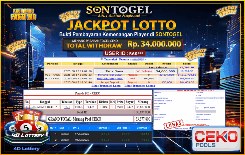 BUKTI JP SONTOGEL – Situs Togel Online, Live Casino dan Slot Online Terpercaya yang terbukti membayar berapapun kemenangan Anda tanpa kekurangan sepeserpun. Jika Anda masih mencari Situs Terpercaya, jangan ragu untuk bermain di SONTOGEL. Dalam 1 akun Anda bisa menikmati semua permainan dengan minimal deposit hanya Rp. 5.000,- saja.