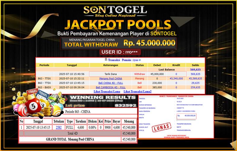 BUKTI JP SONTOGEL – Situs Togel Online, Live Casino dan Slot Online Terpercaya yang terbukti membayar berapapun kemenangan Anda tanpa kekurangan sepeserpun. Jika Anda masih mencari Situs Terpercaya, jangan ragu untuk bermain di SONTOGEL. Dalam 1 akun Anda bisa menikmati semua permainan dengan minimal deposit hanya Rp. 5.000,- saja.