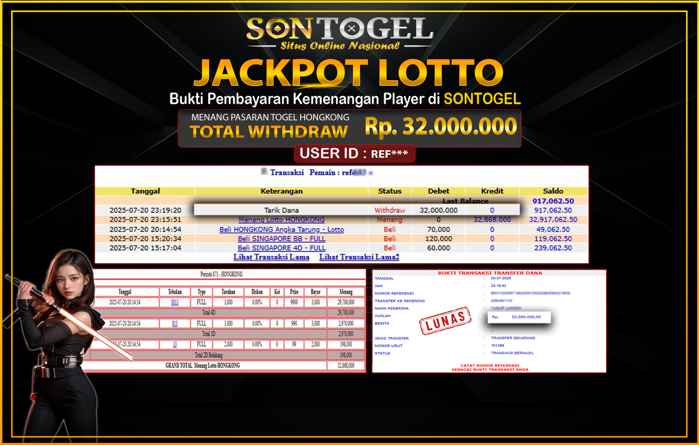 Selamat Kepada Member SONTOGEL dengan USER ID :REF*** PASARAN TOGEL HONGKONG sebesar RP.32.000.000,- LUNAS langsung di transfer ke rekening member tanpa kurang sepeserpun. Terimakasih telah mempercayakan SONTOGEL sebagai Situs Online Terpercaya dan Aman! Jangan tunggu tunggu lagi! langsung saja daftarkan akun bermain di SONTOGEL dan dapatkan bonus berlimpah setiap minggunya.