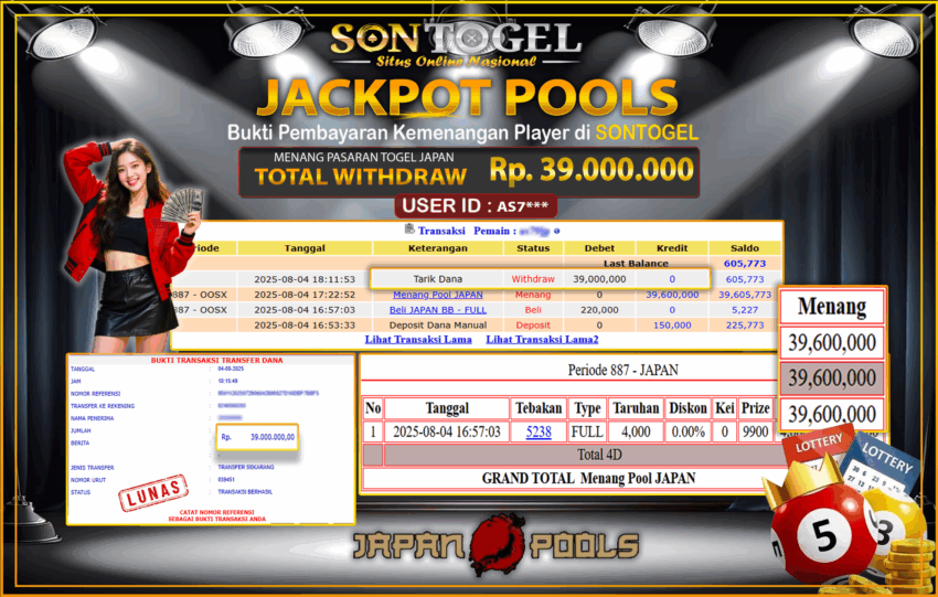 BUKTI JP SONTOGEL – Situs Togel Online, Live Casino dan Slot Online Terpercaya yang terbukti membayar berapapun kemenangan Anda tanpa kekurangan sepeserpun. Jika Anda masih mencari Situs Terpercaya, jangan ragu untuk bermain di SONTOGEL. Dalam 1 akun Anda bisa menikmati semua permainan dengan minimal deposit hanya Rp. 5.000,- saja.