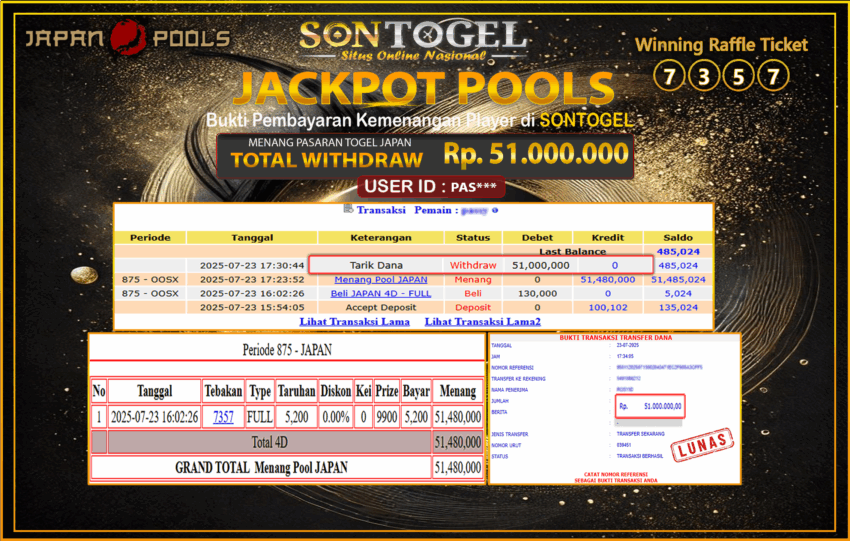 Selamat Kepada Member SONTOGEL dengan USER ID :PAS*** PASARAN TOGEL JAPAN sebesar RP.51.000.000,- LUNAS langsung di transfer ke rekening member tanpa kurang sepeserpun. Terimakasih telah mempercayakan SONTOGEL sebagai Situs Online Terpercaya dan Aman! Jangan tunggu tunggu lagi! langsung saja daftarkan akun bermain di SONTOGEL dan dapatkan bonus berlimpah setiap minggunya.