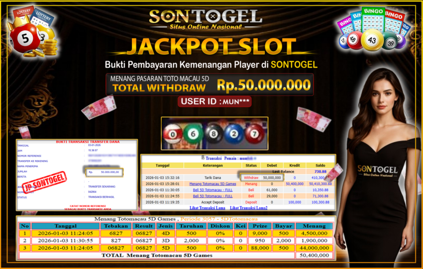 BUKTI JP SONTOGEL – Situs Togel Online, Live Casino dan Slot Online Terpercaya yang terbukti membayar berapapun kemenangan Anda tanpa kekurangan sepeserpun. Jika Anda masih mencari Situs Terpercaya,  jangan ragu untuk bermain di SONTOGEL. Dalam 1 akun Anda bisa menikmati semua permainan dengan minimal deposit hanya Rp. 5.000,- saja.