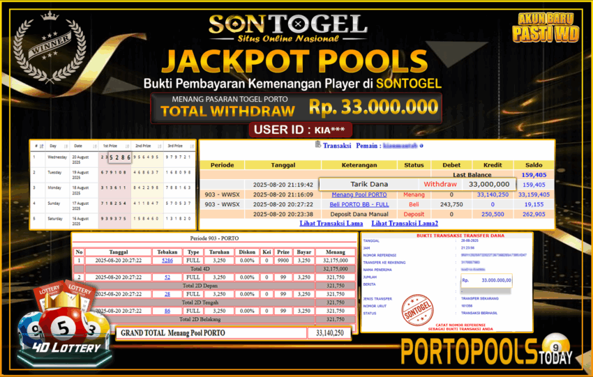 BUKTI JP SONTOGEL – Situs Togel Online, Live Casino dan Slot Online Terpercaya yang terbukti membayar berapapun kemenangan Anda tanpa kekurangan sepeserpun. Jika Anda masih mencari Situs Terpercaya, jangan ragu untuk bermain di SONTOGEL. Dalam 1 akun Anda bisa menikmati semua permainan dengan minimal deposit hanya Rp. 5.000,- saja.