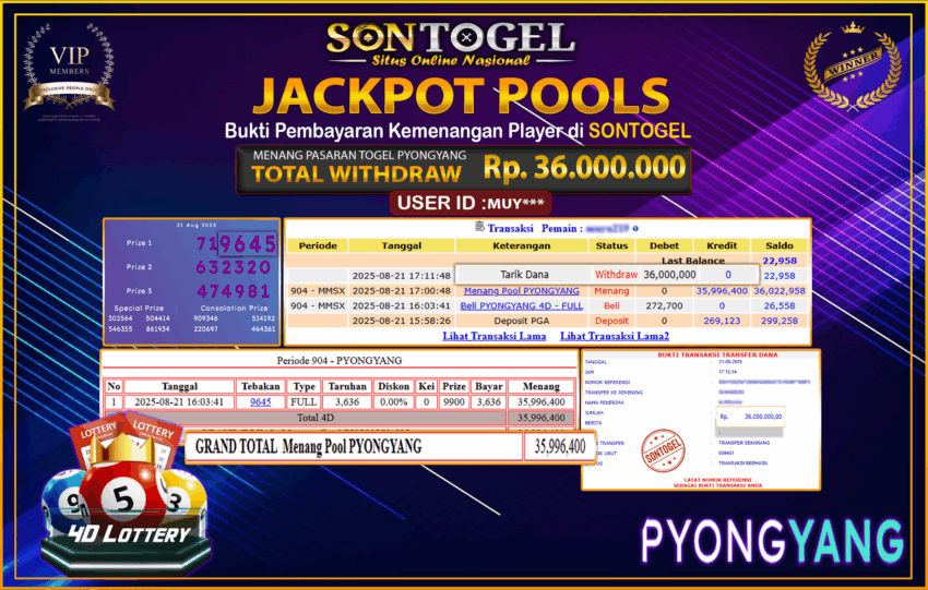 Selamat Kepada Member SONTOGEL dengan USER ID :MUY*** PASARAN TOGEL PYONGYANG sebesar RP.36.000.000,- LUNAS langsung di transfer ke rekening member tanpa kurang sepeserpun. Terimakasih telah mempercayakan SONTOGEL sebagai Situs Online Terpercaya dan Aman! Jangan tunggu tunggu lagi! langsung saja daftarkan akun bermain di SONTOGEL dan dapatkan bonus berlimpah setiap minggunya.