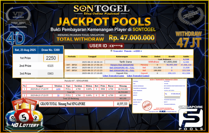 Selamat Kepada Member SONTOGEL dengan USER ID :CEL*** PASARAN TOGEL SINGAPORE sebesar RP.47.000.000,- LUNAS langsung di transfer ke rekening member tanpa kurang sepeserpun. Terimakasih telah mempercayakan SONTOGEL sebagai Situs Online Terpercaya dan Aman! Jangan tunggu tunggu lagi! langsung saja daftarkan akun bermain di SONTOGEL dan dapatkan bonus berlimpah setiap minggunya.