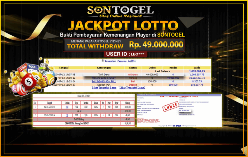 Selamat Kepada Member SONTOGEL dengan USER ID :LEO*** PASARAN TOGEL SYDNEY sebesar RP.49.000.000,- LUNAS langsung di transfer ke rekening member tanpa kurang sepeserpun. Terimakasih telah mempercayakan SONTOGEL sebagai Situs Online Terpercaya dan Aman! Jangan tunggu tunggu lagi! langsung saja daftarkan akun bermain di SONTOGEL dan dapatkan bonus berlimpah setiap minggunya.