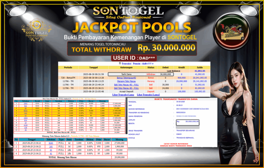 BUKTI JP SONTOGEL – Situs Togel Online, Live Casino dan Slot Online Terpercaya yang terbukti membayar berapapun kemenangan Anda tanpa kekurangan sepeserpun. Jika Anda masih mencari Situs Terpercaya, jangan ragu untuk bermain di SONTOGEL. Dalam 1 akun Anda bisa menikmati semua permainan dengan minimal deposit hanya Rp. 5.000,- saja.