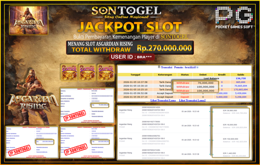 Selamat Kepada Member SONTOGEL dengan USER ID : BRA*** SLOT ASGARDIAN RISING di PG SOFT sebesar RP.270.000.000,- LUNAS langsung di  transfer ke rekening member tanpa kurang sepeserpun. Terimakasih telah mempercayakan SONTOGEL sebagai Situs Online Terpercaya dan Aman! Jangan tunggu tunggu lagi! langsung saja daftarkan akun bermain di SONTOGEL dan dapatkan bonus berlimpah setiap minggunya.