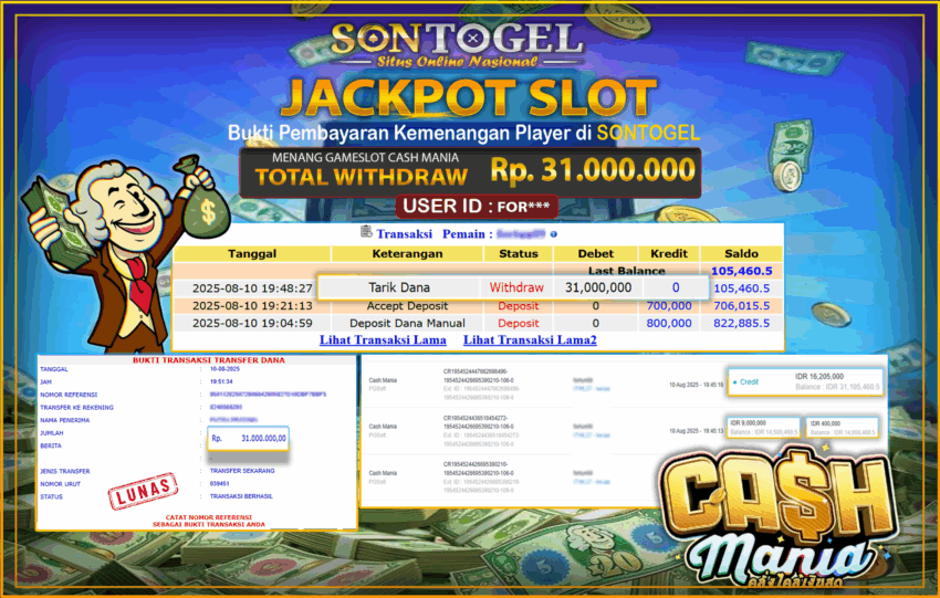 Selamat Kepada Member SONTOGEL dengan USER ID : FOR*** SLOT CASH MANIA di PG Soft Play sebesar RP.31.000.000,- LUNAS langsung di transfer ke rekening member tanpa kurang sepeserpun. Terimakasih telah mempercayakan SONTOGEL sebagai Situs Online Terpercaya dan Aman! Jangan tunggu tunggu lagi! langsung saja daftarkan akun bermain di SONTOGEL dan dapatkan bonus berlimpah setiap minggunya.