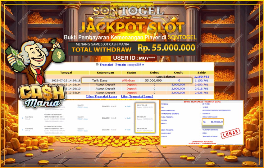 Selamat Kepada Member SONTOGEL dengan USER ID : MUY*** SLOT CASH MANIA di provider PG Soft sebesar RP.55.000.000,- LUNAS langsung di transfer ke rekening member tanpa kurang sepeserpun. Terimakasih telah mempercayakan SONTOGEL sebagai Situs Online Terpercaya dan Aman! Jangan tunggu tunggu lagi! langsung saja daftarkan akun bermain di SONTOGEL dan dapatkan bonus berlimpah setiap minggunya.