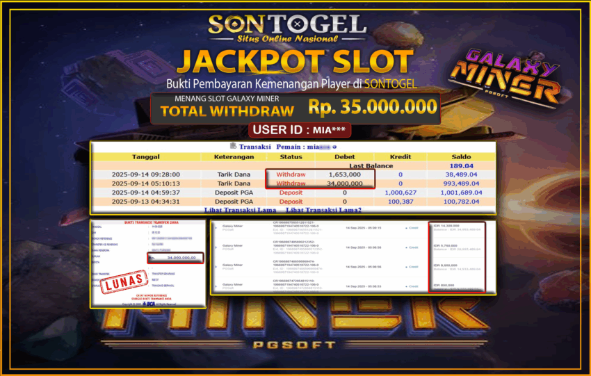 Selamat Kepada Member SONTOGEL dengan USER ID : MIA*** SLOT GALAXY MINER di provider PG Soft sebesar RP.35.000.000,- LUNAS langsung di transfer ke rekening member tanpa kurang sepeserpun. Terimakasih telah mempercayakan SONTOGEL sebagai Situs Online Terpercaya dan Aman! Jangan tunggu tunggu lagi! langsung saja daftarkan akun bermain di SONTOGEL dan dapatkan bonus berlimpah setiap minggunya.
