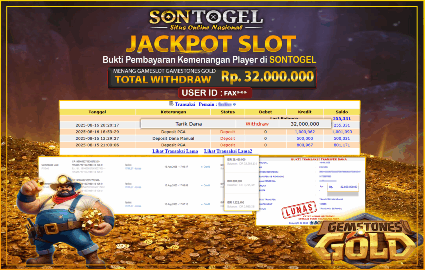 Selamat Kepada Member SONTOGEL dengan USER ID : FAX*** SLOT GAMESTONES GOLD di PG Soft sebesar RP.32.000.000,- LUNAS langsung di transfer ke rekening member tanpa kurang sepeserpun. Terimakasih telah mempercayakan SONTOGEL sebagai Situs Online Terpercaya dan Aman! Jangan tunggu tunggu lagi! langsung saja daftarkan akun bermain di SONTOGEL dan dapatkan bonus berlimpah setiap minggunya.
