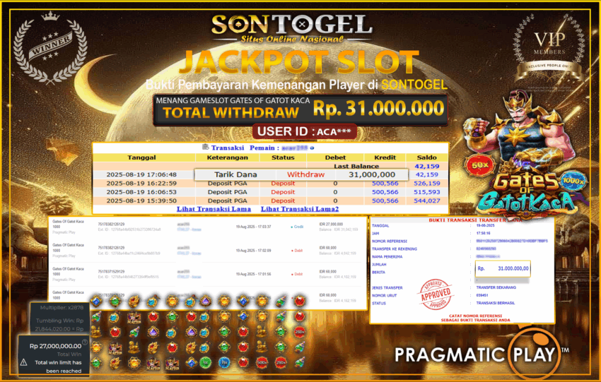 Selamat Kepada Member SONTOGEL dengan USER ID : ACA*** SLOT GATES OF GATOT KACA 1000 di Pragmatic Play sebesar RP.31.000.000,- LUNAS langsung di transfer ke rekening member tanpa kurang sepeserpun. Terimakasih telah mempercayakan SONTOGEL sebagai Situs Online Terpercaya dan Aman! Jangan tunggu tunggu lagi! langsung saja daftarkan akun bermain di SONTOGEL dan dapatkan bonus berlimpah setiap minggunya.