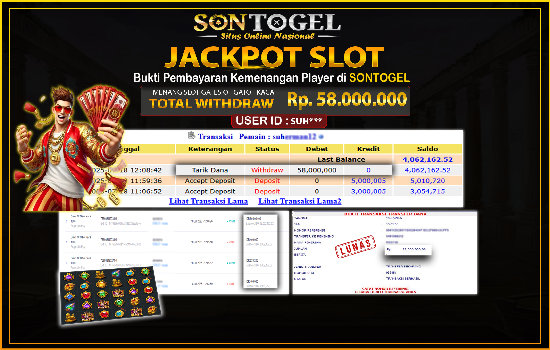 Selamat Kepada Member SONTOGEL dengan USER ID : SUH*** SLOT GATES OF GATOT KACA di provider Pragmatic Play sebesar RP.58.000.000,- LUNAS langsung di transfer ke rekening member tanpa kurang sepeserpun. Terimakasih telah mempercayakan SONTOGEL sebagai Situs Online Terpercaya dan Aman! Jangan tunggu tunggu lagi! langsung saja daftarkan akun bermain di SONTOGEL dan dapatkan bonus berlimpah setiap minggunya.