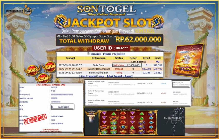 Selamat Kepada Member SONTOGEL dengan USER ID : BAR*** SLOT OLYMPUS SUPER SCATTER di provider Pragmatic Play sebesar RP.62.000.000,- LUNAS langsung di  transfer ke rekening member tanpa kurang sepeserpun. Terimakasih telah mempercayakan SONTOGEL sebagai Situs Online Terpercaya dan Aman! Jangan tunggu tunggu lagi! langsung saja daftarkan akun bermain di SONTOGEL dan dapatkan bonus berlimpah setiap minggunya.