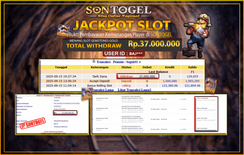 Selamat Kepada Member SONTOGEL dengan USER ID : BAJ*** SLOT GEMSTONES GOLD di provider PG Soft sebesar RP.37.000.000,- LUNAS langsung di transfer ke rekening member tanpa kurang sepeserpun. Terimakasih telah mempercayakan SONTOGEL sebagai Situs Online Terpercaya dan Aman! Jangan tunggu tunggu lagi! langsung saja daftarkan akun bermain di SONTOGEL dan dapatkan bonus berlimpah setiap minggunya.