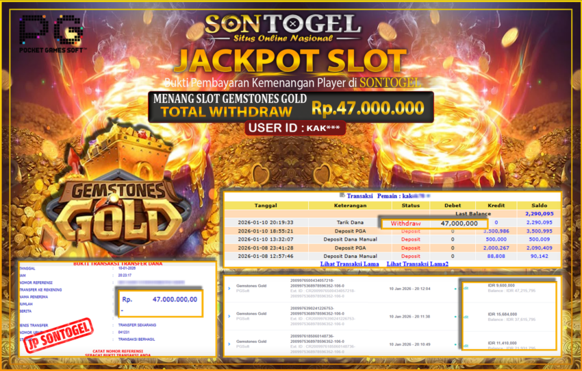 Selamat Kepada Member SONTOGEL dengan USER ID : KAK*** SLOT SLOT GEMSTONES GOLD di PG SOFT sebesar RP.47.000.000,- LUNAS langsung di  transfer ke rekening member tanpa kurang sepeserpun. Terimakasih telah mempercayakan SONTOGEL sebagai Situs Online Terpercaya dan Aman! Jangan tunggu tunggu lagi! langsung saja daftarkan akun bermain di SONTOGEL dan dapatkan bonus berlimpah setiap minggunya.