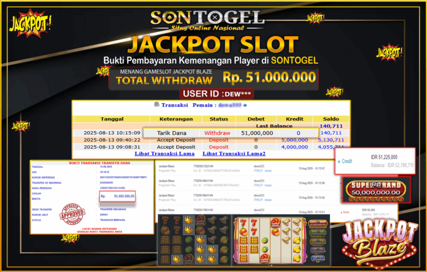 Selamat Kepada Member SONTOGEL dengan USER ID : DEW*** SLOT JACKPOT BLAZE di Pragmatic Play Play sebesar RP.51.000.000,- LUNAS langsung di transfer ke rekening member tanpa kurang sepeserpun. Terimakasih telah mempercayakan SONTOGEL sebagai Situs Online Terpercaya dan Aman! Jangan tunggu tunggu lagi! langsung saja daftarkan akun bermain di SONTOGEL dan dapatkan bonus berlimpah setiap minggunya.