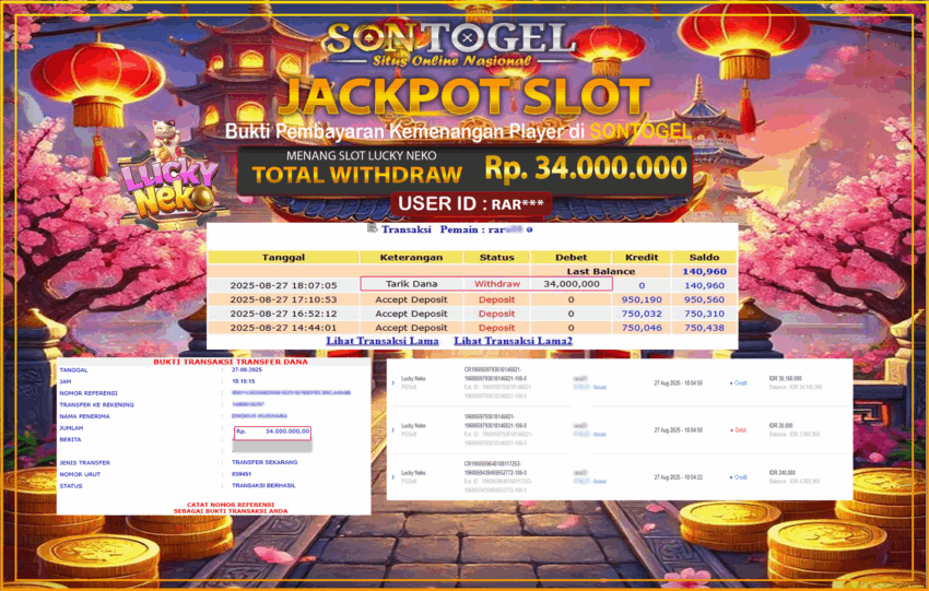 Selamat Kepada Member SONTOGEL dengan USER ID : RAR*** SLOT LUCKY NEKO di PG Soft sebesar RP.34.000.000,- LUNAS langsung di transfer ke rekening member tanpa kurang sepeserpun. Terimakasih telah mempercayakan SONTOGEL sebagai Situs Online Terpercaya dan Aman! Jangan tunggu tunggu lagi! langsung saja daftarkan akun bermain di SONTOGEL dan dapatkan bonus berlimpah setiap minggunya.