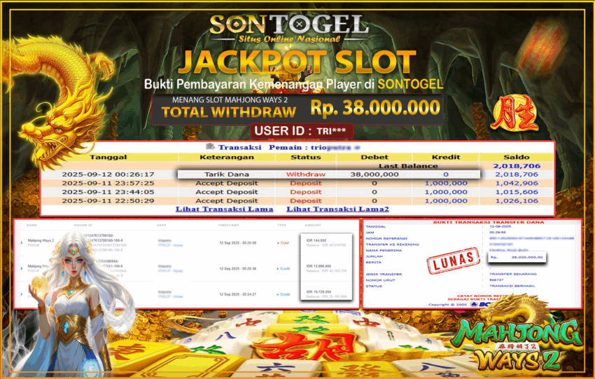 Selamat Kepada Member SONTOGEL dengan USER ID : TRI*** SLOT MAHJONG WAYS 2 di provider PG Soft sebesar RP.38.000.000,- LUNAS langsung di transfer ke rekening member tanpa kurang sepeserpun. Terimakasih telah mempercayakan SONTOGEL sebagai Situs Online Terpercaya dan Aman! Jangan tunggu tunggu lagi! langsung saja daftarkan akun bermain di SONTOGEL dan dapatkan bonus berlimpah setiap minggunya.