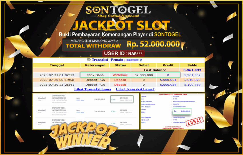 Selamat Kepada Member SONTOGEL dengan USER ID : NAR*** SLOT MAHJONG WAYS 2 di provider PG Soft sebesar RP.52.000.000,- LUNAS langsung di  transfer ke rekening member tanpa kurang sepeserpun. Terimakasih telah mempercayakan SONTOGEL sebagai Situs Online Terpercaya dan Aman! Jangan tunggu tunggu lagi! langsung saja daftarkan akun bermain di SONTOGEL dan dapatkan bonus berlimpah setiap minggunya.