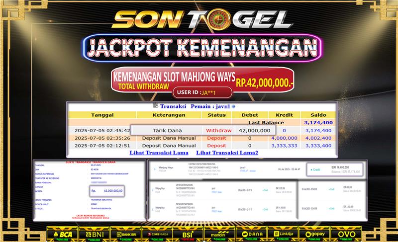 Selamat Kepada Member SONTOGEL dengan USER ID : JAV*** SLOT MAHJONG WAYS di provider PG Soft sebesar RP.42.000.000,- LUNAS langsung di  transfer ke rekening member tanpa kurang sepeserpun. Terimakasih telah mempercayakan SONTOGEL sebagai Situs Online Terpercaya dan Aman! Jangan tunggu tunggu lagi! langsung saja daftarkan akun bermain di SONTOGEL dan dapatkan bonus berlimpah setiap minggunya.