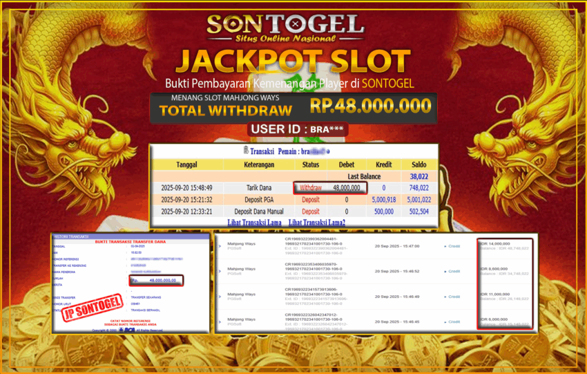 Selamat Kepada Member SONTOGEL dengan USER ID : BRA*** SLOT MAHJONG WAYS di provider PG Soft sebesar RP.48.000.000,- LUNAS langsung di  transfer ke rekening member tanpa kurang sepeserpun. Terimakasih telah mempercayakan SONTOGEL sebagai Situs Online Terpercaya dan Aman! Jangan tunggu tunggu lagi! langsung saja daftarkan akun bermain di SONTOGEL dan dapatkan bonus berlimpah setiap minggunya.