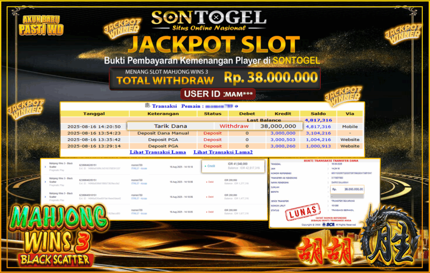 Selamat Kepada Member SONTOGEL dengan USER ID : MAM*** SLOT MAHJONG WINS 3 di Pragmatic Play sebesar RP.38.000.000,- LUNAS langsung di transfer ke rekening member tanpa kurang sepeserpun. Terimakasih telah mempercayakan SONTOGEL sebagai Situs Online Terpercaya dan Aman! Jangan tunggu tunggu lagi! langsung saja daftarkan akun bermain di SONTOGEL dan dapatkan bonus berlimpah setiap minggunya.