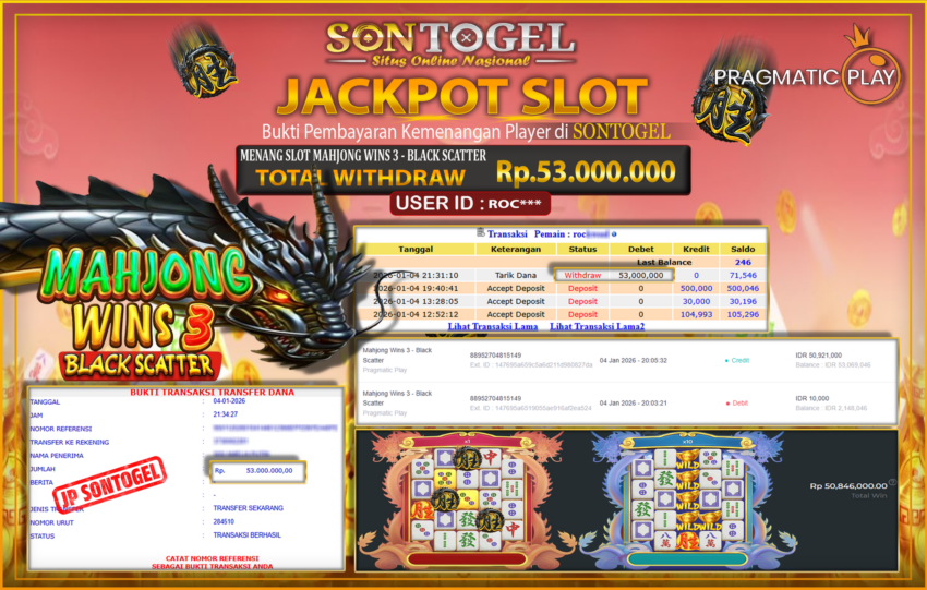 Selamat Kepada Member SONTOGEL dengan USER ID : ROC*** SLOT MAHJONG WINS 3 – BLACK SCATTER di Pragmatic Play sebesar RP.53.000.000,- LUNAS langsung di transfer ke rekening member tanpa kurang sepeserpun. Terimakasih telah mempercayakan SONTOGEL sebagai Situs Online Terpercaya dan Aman! Jangan tunggu tunggu lagi! langsung saja daftarkan akun bermain di SONTOGEL dan dapatkan bonus berlimpah setiap minggunya.