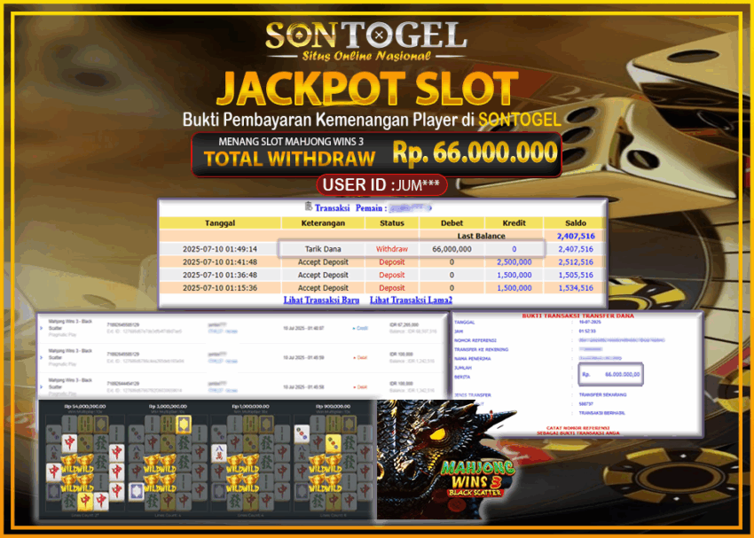 Selamat Kepada Member SONTOGEL dengan USER ID : JUM*** SLOT MAHJONG WINS 3 di provider Pragmatic Play sebesar RP.66.000.000,- LUNAS langsung di  transfer ke rekening member tanpa kurang sepeserpun. Terimakasih telah mempercayakan SONTOGEL sebagai Situs Online Terpercaya dan Aman! Jangan tunggu tunggu lagi! langsung saja daftarkan akun bermain di SONTOGEL dan dapatkan bonus berlimpah setiap minggunya.