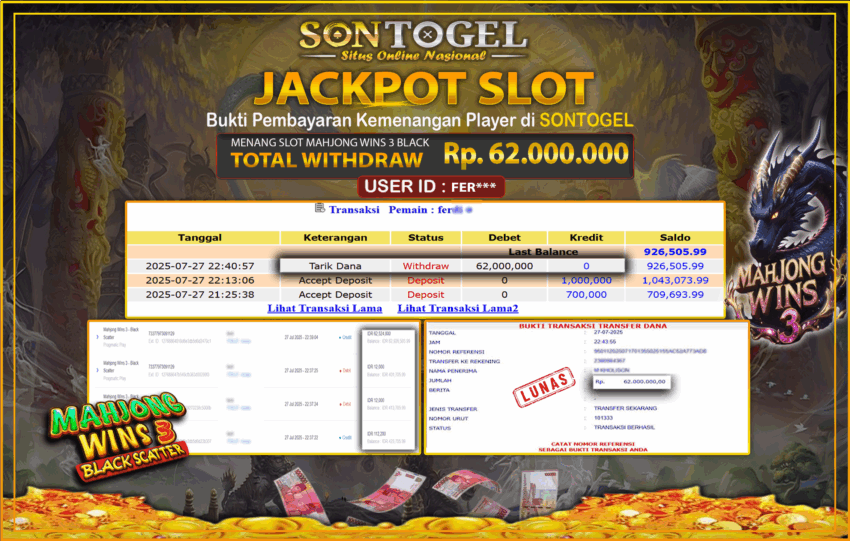 Selamat Kepada Member SONTOGEL dengan USER ID : FER*** SLOT MAHJONG WINS 3 BLACK di provider Pragmatic Play sebesar RP.62.000.000,- LUNAS langsung di  transfer ke rekening member tanpa kurang sepeserpun. Terimakasih telah mempercayakan SONTOGEL sebagai Situs Online Terpercaya dan Aman! Jangan tunggu tunggu lagi! langsung saja daftarkan akun bermain di SONTOGEL dan dapatkan bonus berlimpah setiap minggunya.
