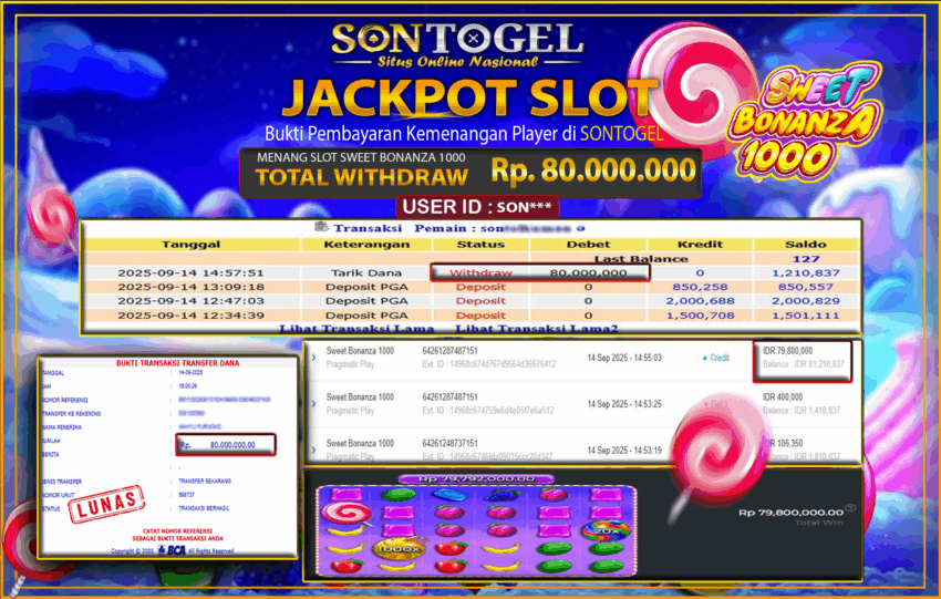 Berikut ini adalah BUKTI JP SONTOGEL yang sudah diproseskan ke rekening member kami