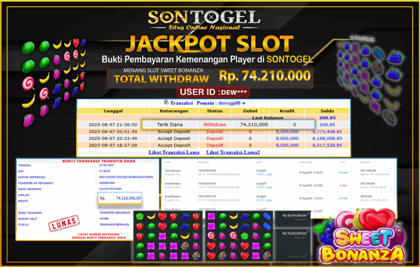 Selamat Kepada Member SONTOGEL dengan USER ID : DEW*** SLOT SLOT SWEET BONANZA di Pragmatic Play Play sebesar RP.74.210.000,- LUNAS langsung di transfer ke rekening member tanpa kurang sepeserpun. Terimakasih telah mempercayakan SONTOGEL sebagai Situs Online Terpercaya dan Aman! Jangan tunggu tunggu lagi! langsung saja daftarkan akun bermain di SONTOGEL dan dapatkan bonus berlimpah setiap minggunya.