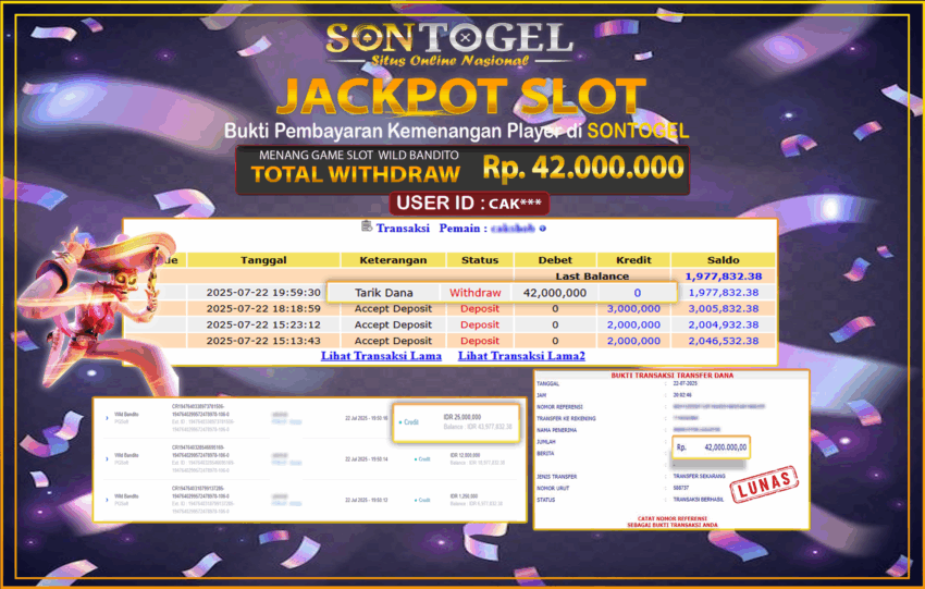 Selamat Kepada Member SONTOGEL dengan USER ID : CAK*** SLOT WILD BANDITO di provider PG Soft sebesar RP.42.000.000,- LUNAS langsung di transfer ke rekening member tanpa kurang sepeserpun. Terimakasih telah mempercayakan SONTOGEL sebagai Situs Online Terpercaya dan Aman! Jangan tunggu tunggu lagi! langsung saja daftarkan akun bermain di SONTOGEL dan dapatkan bonus berlimpah setiap minggunya.