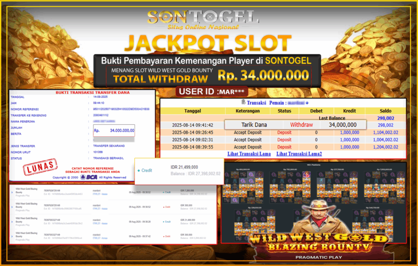 Selamat Kepada Member SONTOGEL dengan USER ID : MAR*** SLOT WILD WEST GOLD BLAZING BOUNTY di Pragmatic Play Play sebesar RP.34.000.000,- LUNAS langsung di  transfer ke rekening member tanpa kurang sepeserpun. Terimakasih telah mempercayakan SONTOGEL sebagai Situs Online Terpercaya dan Aman! Jangan tunggu tunggu lagi! langsung saja daftarkan akun bermain di SONTOGEL dan dapatkan bonus berlimpah setiap minggunya.