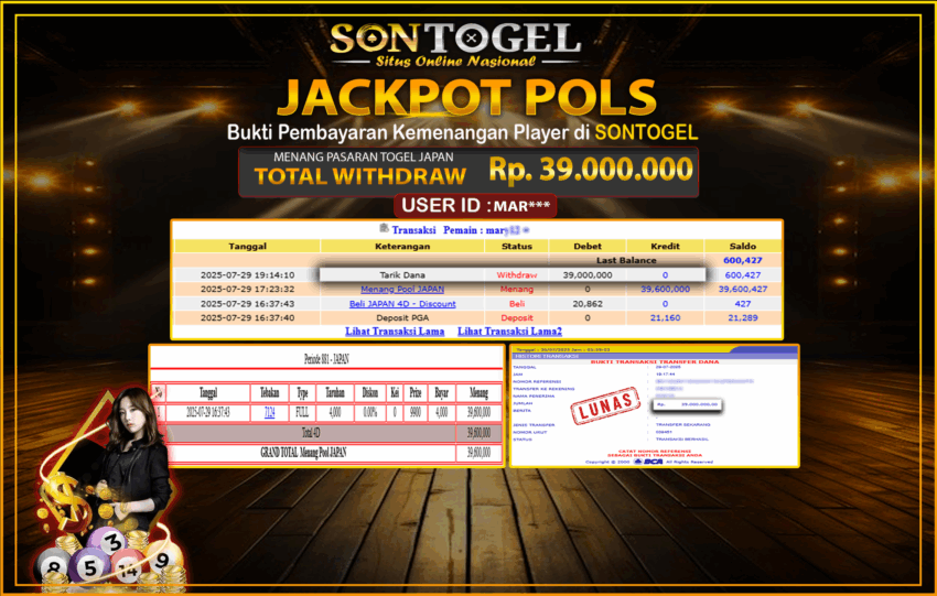 BUKTI JP SONTOGEL – Situs Togel Online, Live Casino dan Slot Online Terpercaya yang terbukti membayar berapapun kemenangan Anda tanpa kekurangan sepeserpun. Jika Anda masih mencari Situs Terpercaya, jangan ragu untuk bermain di SONTOGEL. Dalam 1 akun Anda bisa menikmati semua permainan dengan minimal deposit hanya Rp. 5.000,- saja.