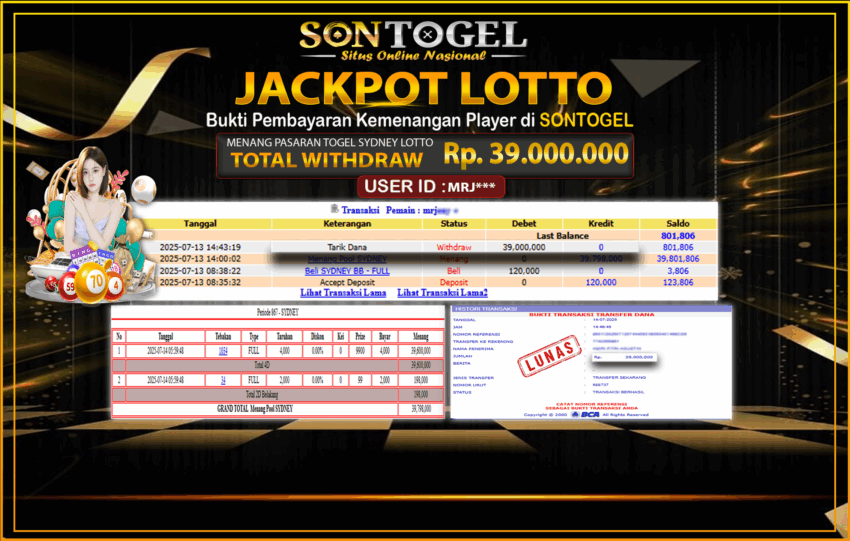 Selamat Kepada Member SONTOGEL dengan USER ID :MRJ*** PASARAN TOGEL SYDNEY sebesar RP.39.000.000,- LUNAS langsung di transfer ke rekening member tanpa kurang sepeserpun. Terimakasih telah mempercayakan SONTOGEL sebagai Situs Online Terpercaya dan Aman! Jangan tunggu tunggu lagi! langsung saja daftarkan akun bermain di SONTOGEL dan dapatkan bonus berlimpah setiap minggunya.