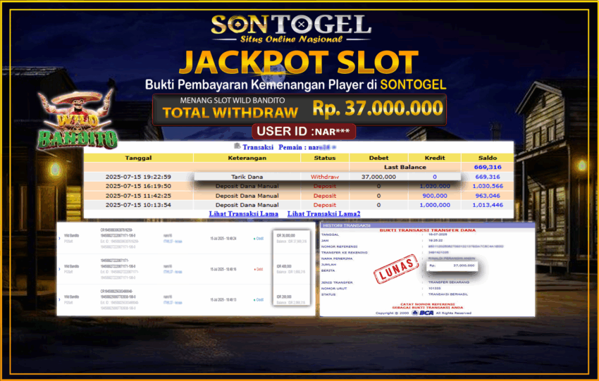 Selamat Kepada Member SONTOGEL dengan USER ID : NAR*** SLOT WILD BANDITO di provider Pragmatic Play sebesar RP.37.000.000,- LUNAS langsung di transfer ke rekening member tanpa kurang sepeserpun. Terimakasih telah mempercayakan SONTOGEL sebagai Situs Online Terpercaya dan Aman! Jangan tunggu tunggu lagi! langsung saja daftarkan akun bermain di SONTOGEL dan dapatkan bonus berlimpah setiap minggunya.